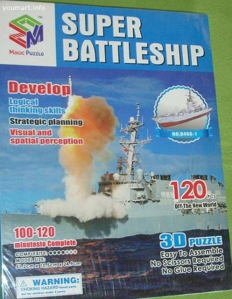 Модель для сборки 3D-пазл Линейный корабль 120 деталей Super Battleship Magic Puzzle – это современный трёхмерный конструктор, позволяющий собрать большой 51 см боевой линкор с пушками по бокам , на носу и корме. Объемная модель боевого корабля в точности повторяет вид настоящего линкора.