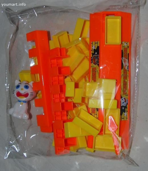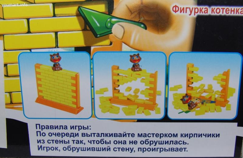 В составе – основа стены, 44 кирпичика, 2 мастерка и фигура котенка