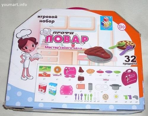 В состав комплекта входят 32 предмета: полочка, лопатка, поварешка, 2 вилки, 2 ложки, 2 ножа, кастрюля, крышка, солонка, перечница, дощечка, 2 тарелки, кран, 2 баночки, стейк, яичница, курица, пицца, ребрышки, фиксатор для чемоданчика, 3 наклейки, коробочка для джема, коробочка для молока, фон для кухни