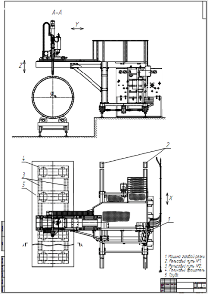 Передвижная установка консольного типа с ЧПУ вырезает детали по заданной программе. Движется по рельсам вдоль трубы (до 15,5 м), которая установлена на роликовых опорах с функцией вращения. Тележка оснащена мотор-редуктором, осью Z для перемещения резака и управляется с пульта (стационарного или выносного).