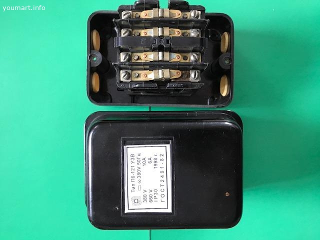 Пускатель магнитный тип П6-121 У3Б закрытый, без реверса, без теплового реле. Номинальный ток главных контактов 10А. Класс защиты IP30.